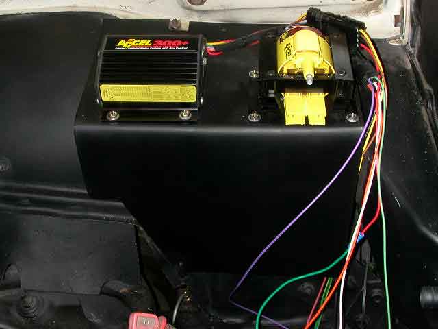 Here is my custom made sheet metal panel that I made to hold my Accel 300+ Electronic Multispark Discharge Ignition with rev limiter and matching high voltage coil. I didn't want to drill holes into my firewall to install these there. This is also bolted on so it can be removed incase access to the heater core is ever required. The panel is 1/16th sheet metal from the local lowes. It was kinda flimzy but once It was bent into shape and the ignition stuff mounted on it stiffened up nicely.