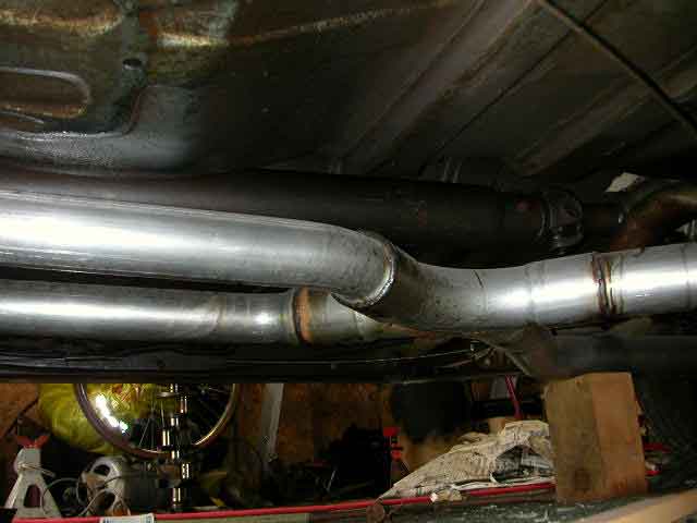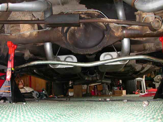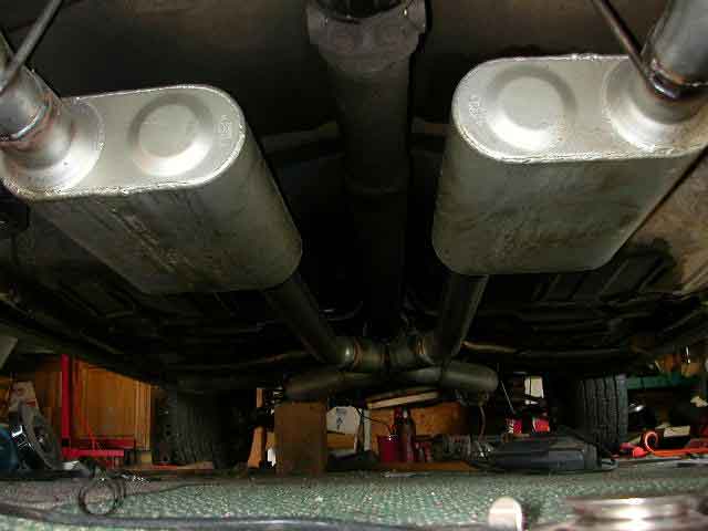 Finally my exhaust. Full dual 2.5" mandrel bends, X-pipe, with dual 40 series flow masters running all the way to the rear bumper. No chrome tips yet as I need to straighten my rear bumper since its dented and hangs down about a half inch to low for the chrome tips to clear. I was surprized by how quite the exhaust was at idle but once you stomped the pedal it came alive to let everyone know there was a powerful v8 under that 4 doors hood!