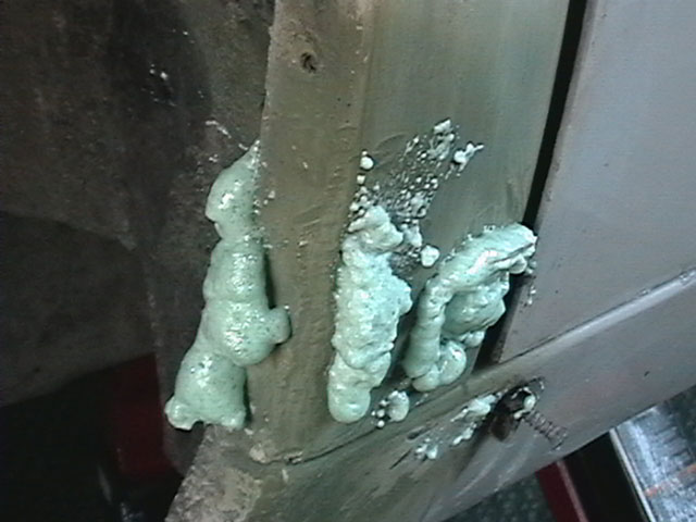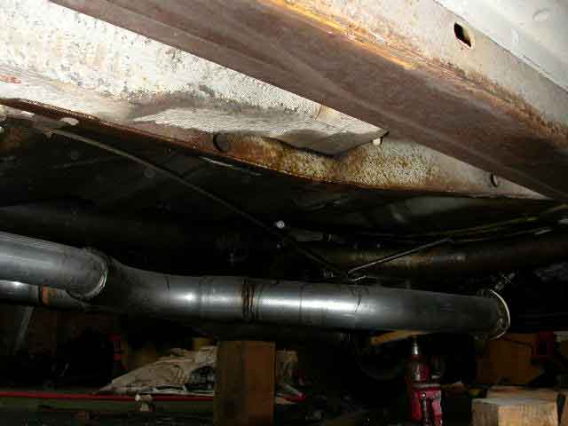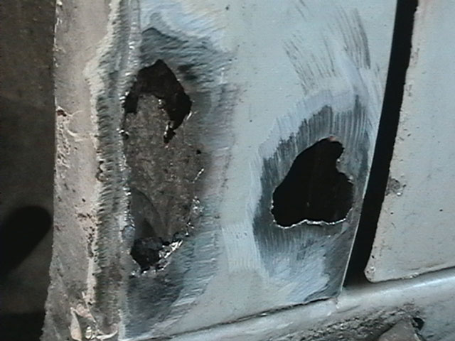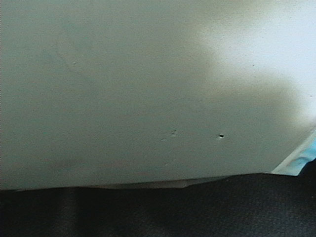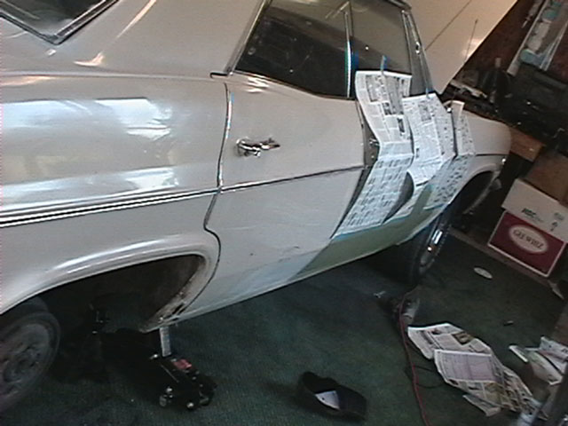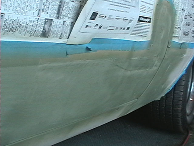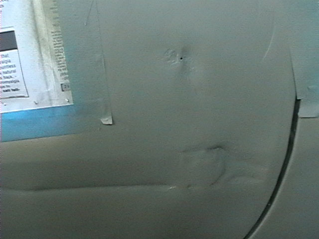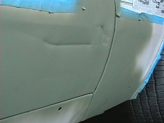 Updates. As of 6-21-2004. I decided to take the car to the track this coming friday and wanted to finish up a little more body work before then. This is the passenger side damage caused by the trailer I was towing the car 75 miles to the nearest place that does mandrel bent exhaust systems when my trailer blew a tire and jack knifed the truck. The car slide into the wheel guards of the trailer causing the long dents down the side. The holes near the rear wheel was a little rust spot that I decided to take care of that ended up being rusted out holes. I sanded them down to bare metal on both sides and sprayed it all down inside and out with a hefty dose of rust conversion cemicals. I then filled the are with some poly expanding foam as a base to lay a peice of fiberglass over, it also helps keep moisture off the back of the panel. I will sand this down till is just under the surface of the metal and lay a patch of resin and fiber glass over it then sand it all smooth and finish off with bondo if nessasary. The door was sanded to bare metal and has a green coat of metal prep and is 400 grit sanded and ready to be filled with bondo. There was no easy access to behind the panel to be able to work the metal any smoother so bondo will have to do the finish work.