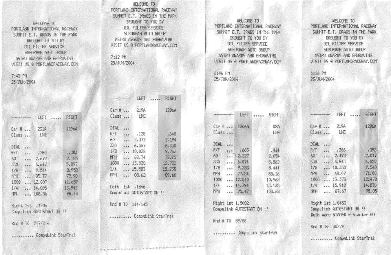 Updates. As of 6-27-2004. Here are the first 8 dragstrip runs with the car and new motor. My track number is 1206A and are highlighted gray in the timeslips. Also check out the video section if you would like to see all 8 of these runs for yourself.